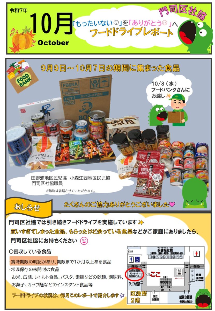 門司区社協 地域活動レポート フードドライブレポート10月号 2025.10.10 門司区社協 NEW 9月9日~10月7日の期間に集まった食品です。 たくさんのご協力ありがとうございました! 引き続き、フードドライブ事業にご協力をお願いいたします。