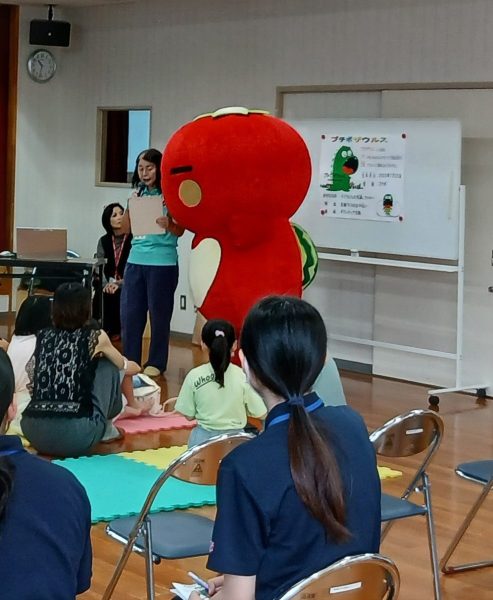 休憩タイムでは、若松区のわかッパが登場し、子どもたちが楽しんでいました。