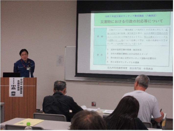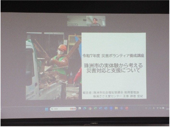 10月10日(金)災害ボランティア養成講座を八幡西区のコムシティで開催しました。今回は災害時ボランティアとしての基礎知識を学ぶとともに、珠洲市社会福祉協議会 主事 神徳 宏紀様とZOOMで結び、珠洲市での地震や水害の実体験を通しての災害対応や支援の在り方を講義頂きました。さらに北九州市危機管理室 中島 典章防災専門官を講師に災害時における行政の対応等について学びました。
