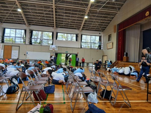 地域住民は、体育館を利用しての「シェイクアウト訓練」と「バケツリレー」を体験、