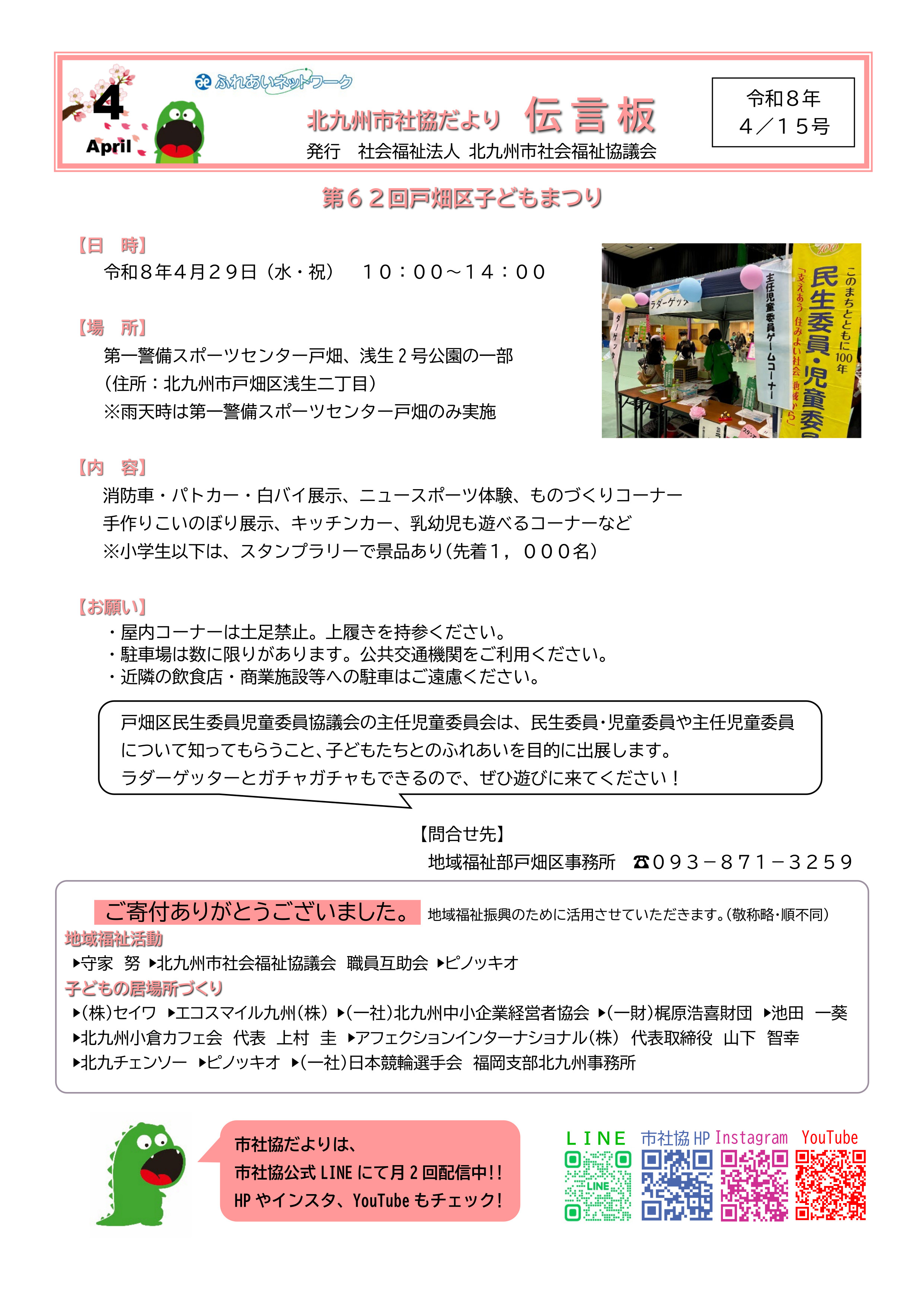 発刊物一覧 市社協だより 令和8年4月15日号 令和8年4月1日号 令和8年3月15日号 令和8年3月1日号 令和8年2月15日号 令和8年2月1日号 過去の市社協だより一覧はこちら 区社協だより もじくしゃきょうだより 第131号(令和8年1月) こくら北しゃきょうだより 第183号(令和8年4月) みなみしゃきょう 第153号(令和8年1月) わかまつ社協だより『しあわせ』 No.144(令和8年2月) 八幡東区社会福祉協議会だより No.89(令和8年4月) やはた西社協だより No.330(令和8年4月) とばた区社協だより 第92号(令和7年9月) 過去の区社協だより一覧はこちら